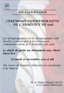 Les Gragnaguaises et les Gragnaguais sont invités à participer à la Cérémonie commémoration de l’Armistice de 1918.