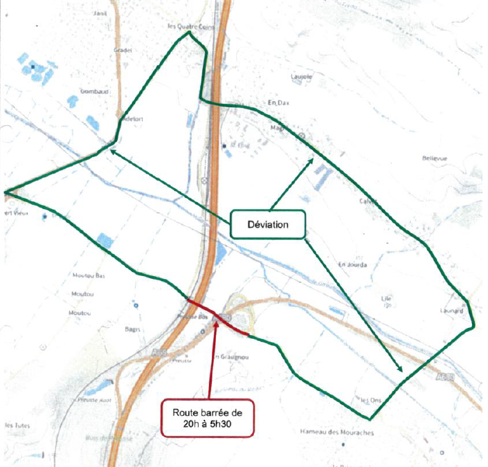 Dans les cadre de l’élargissement de  l’A680, jusqu’au 28 juin 2024,  la départementale D20  pourra être fermée  de nuit ( à compter de 20 heures), au  niveau du pont en travaux qui se trouve en direction de Castelmaurou. La déviation se trouvant sur le plan joint  est mise en place